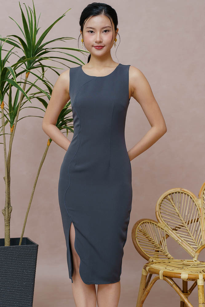 If you are drawn to something with a subtle metallic quality built into the fabric, the Octavia Wavy Slit Dress in Cool Gray offers that kind of considered shimmer without tipping into full evening-gown territory.
