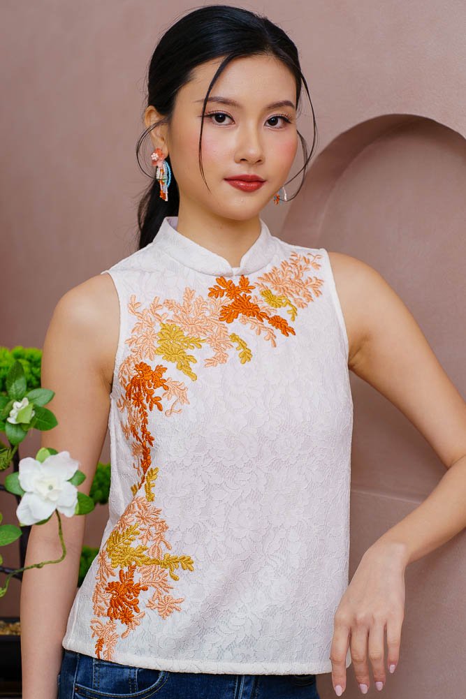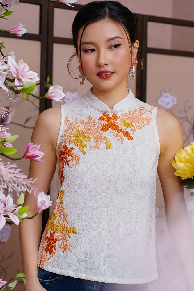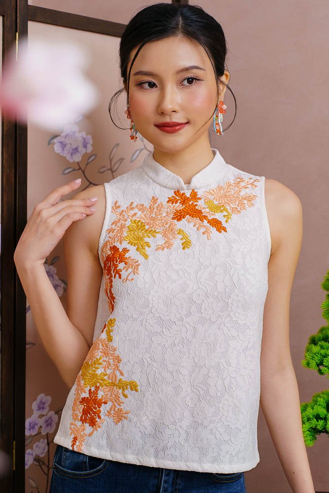 BLOOMINGDALE EMBROIDERED LACE CHEONGSAM TOP (WHITE)