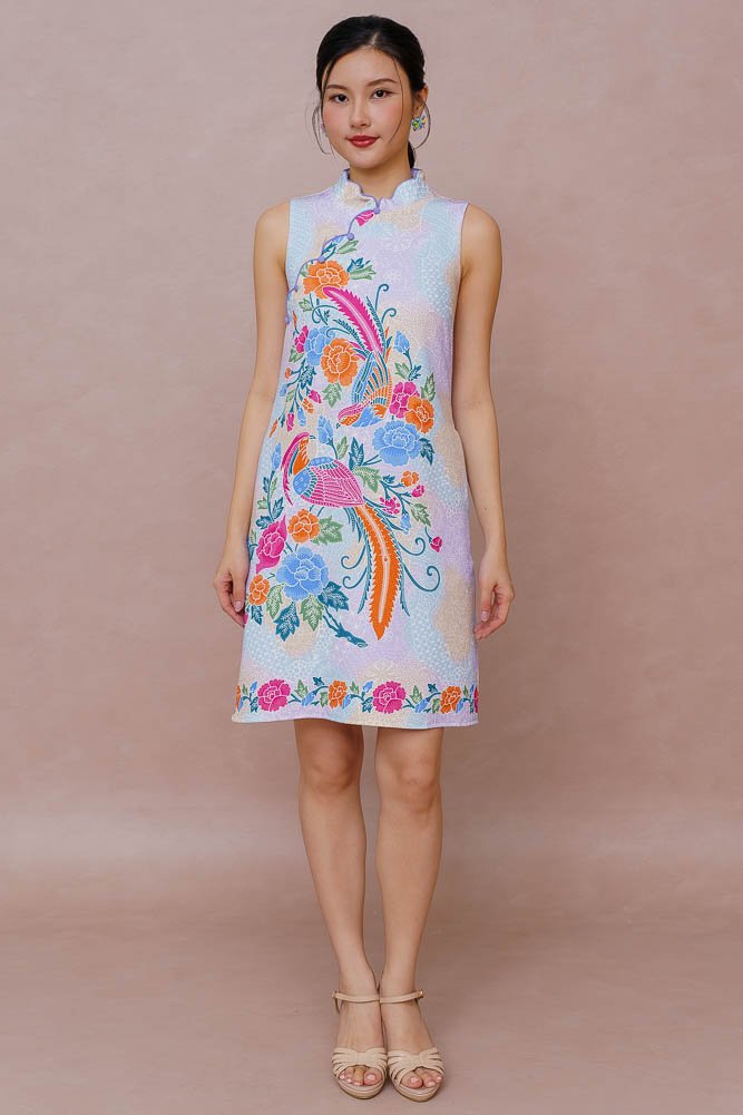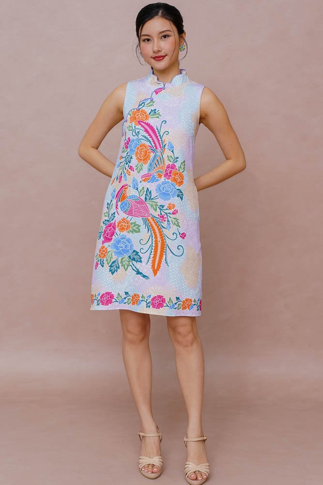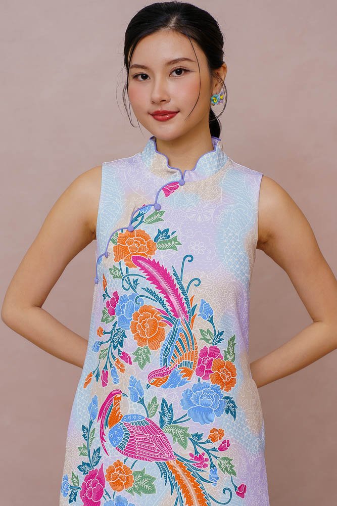 DANCE OF THE MYTHIC PLUMES BATIK CHEONGSAM DRESS (LILAC LEMON SKY)