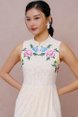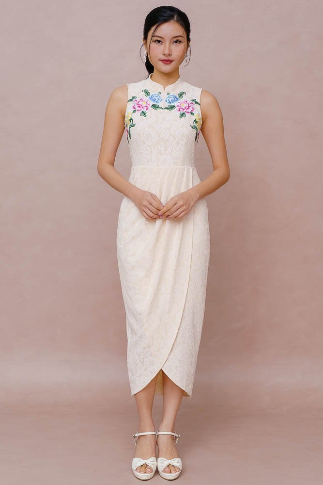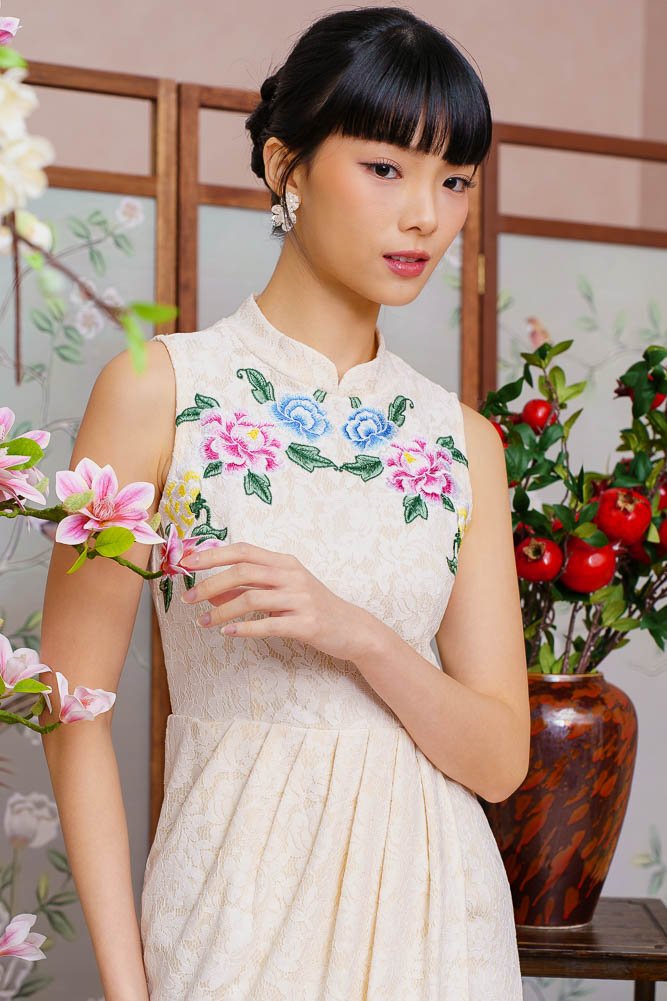 FLEUR DE LUMIERE EMBROIDERED LACE CHEONGSAM DRESS (MAGNOLIA WHITE)