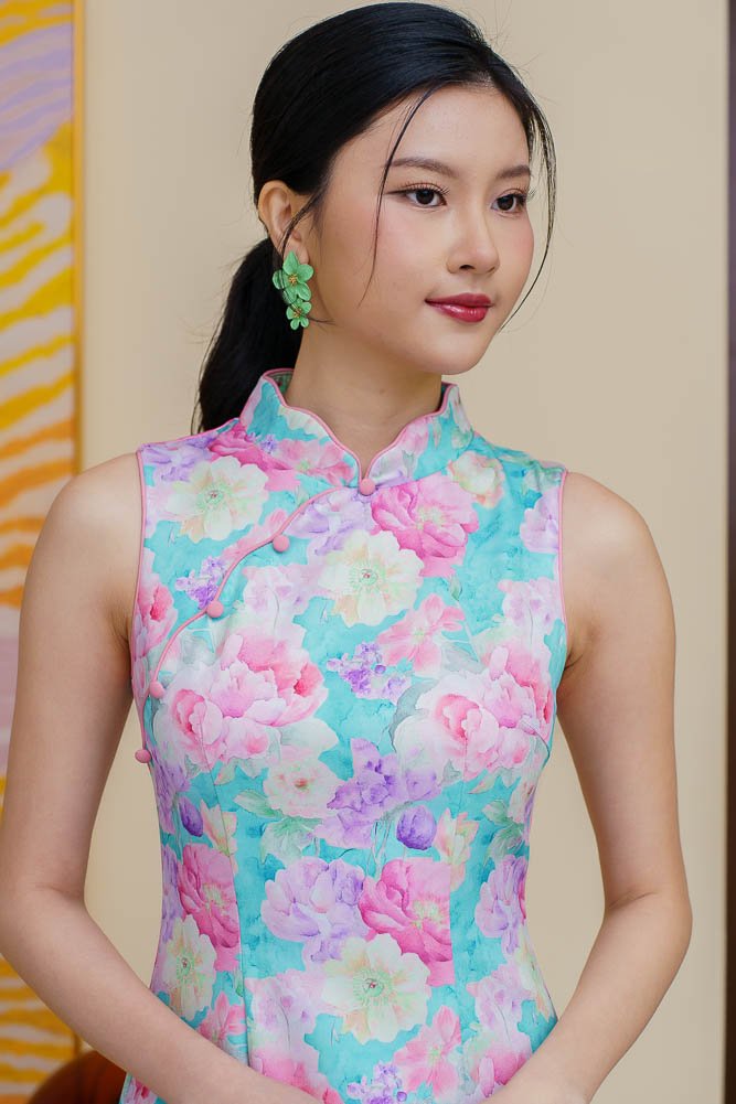 FLOWERS OF THE CLOUD GARDEN SIDE SLIT CHEONGSAM DRESS (PEARL JADE)