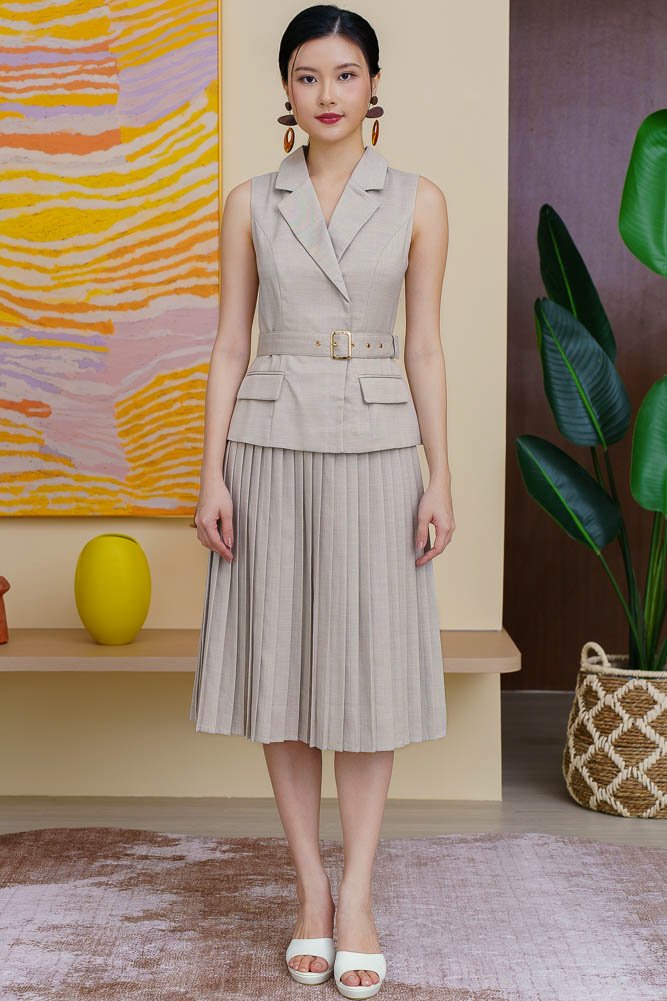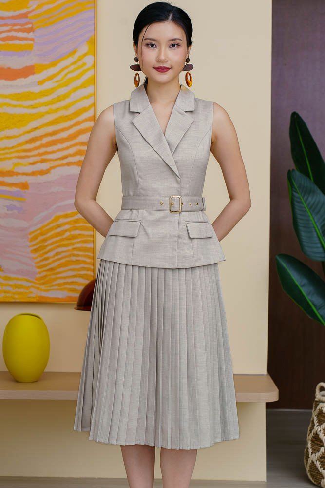 OLYMPIA PLEATED BLAZER DRESS (LIGHT SAND)