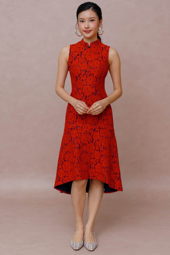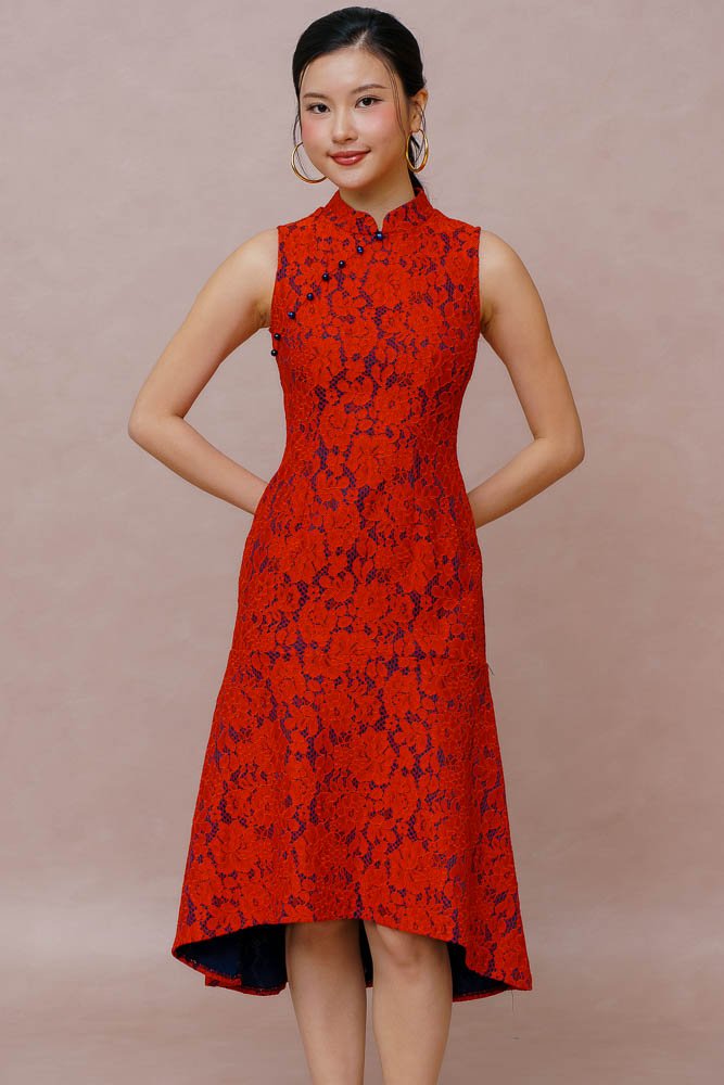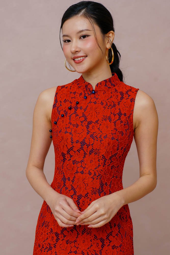 PEARL OF THE ORIENT GUIPURE LACE QIPAO (SCARLET RED)